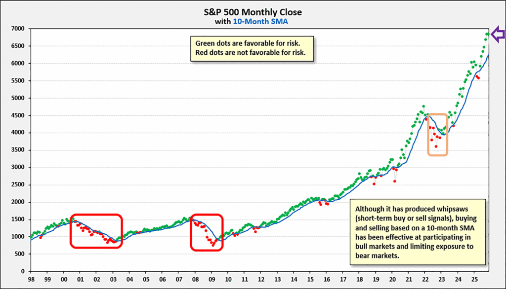 Looking ahead to 2026, the long-term stock market trend remains constructive. The S&P 500’s monthly closing price continues to trade well above its 10-month simple moving average (SMA)—a reliable indicator of underlying market strength. (See the green dots and blue trendline in the chart below.)