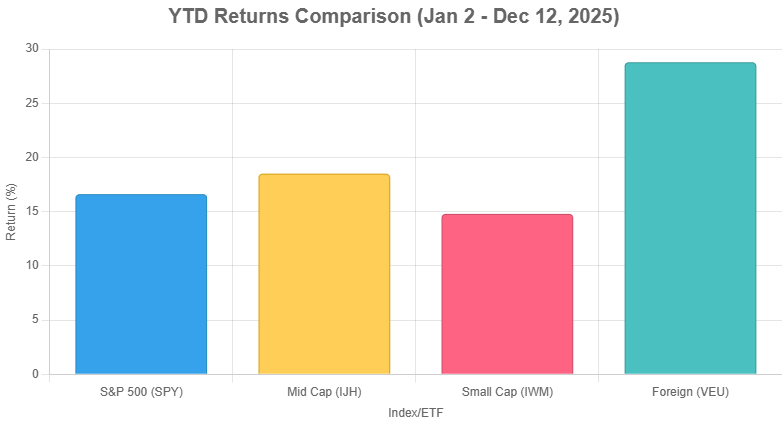 Stocks showed remarkable resilience throughout 2025, with the S&P 500 on track for its third consecutive year of double-digit gains. Large-cap indices like the S&P 500 remain near their yearly highs despite occasional pullbacks fueled by concerns over AI valuations, a softening labor market, and uncertainty about interest rates.