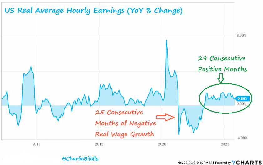 Despite lingering effects from earlier price surges, consumers have benefited from wages outpacing inflation for an extended period. This represents a dramatic shift from the 2021-2022 inflationary environment. (See the shift in average hourly earnings in the chart below.)