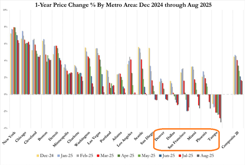 Home prices in several major metros have moderated, with notable year-over-year softening or declines in cities like Tampa, Phoenix, Dallas, Denver, and San Francisco. Absent conventional easing (e.g., rate cuts, stimulus programs, etc.) and unconventional Fed activity (e.g., quantitative easing, asset twists, etc.), home purchases and refinancing could falter in 2026.