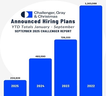 3. Reduced Hiring Plans: U.S. employers plan to hire 205,000 new employees in 2025, a 58% drop from 2024 and the lowest year-to-date total since 2009.