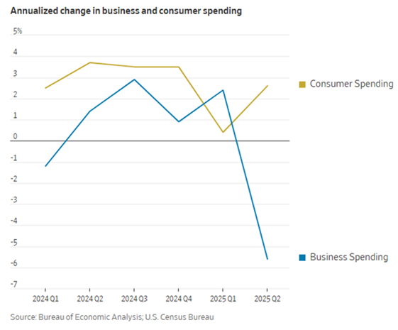 This escalation may be affecting the U.S. economy, as evidenced by a widening gap between consumer and business spending. The reduction in business spending suggests that companies are adopting a more cautious approach.