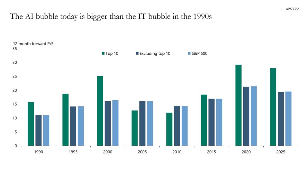 3. AI Overvaluation: The top 10 companies in today’s stock market are more overvalued based on traditional metrics than the top 10 were in the 1990s. The tech bubble’s collapse in the late 1990s led to losses exceeding 75% for many dot-com companies, raising concerns about similar risks today.
