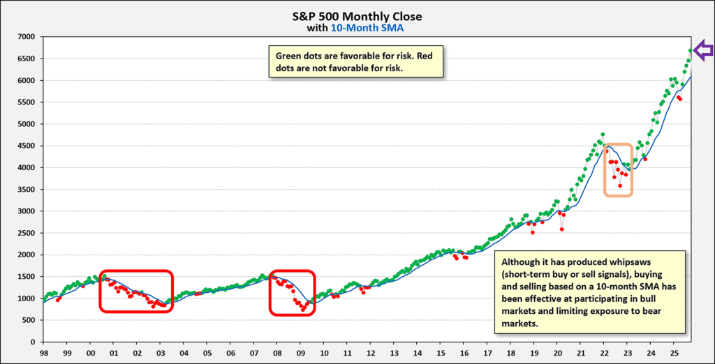 In line with Pacific Park’s discipline, we will reduce our stock allocation if the blue trendline’s slope shifts from positive to negative and if we receive a red dot alert indicating that the monthly closing price has fallen below its longer-term trend. We would also raise cash for protective purposes.