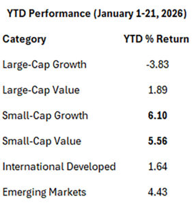 Geopolitical headlines and key economic data can spark short-term volatility. In January 2026, we’ve seen the U.S.-led capture of Maduro in Venezuela, civil unrest in Iran, and consistent discussion regarding the White House’s pursuit of Greenland. As a result, stocks may continue trading in wider ranges than might otherwise be anticipated.