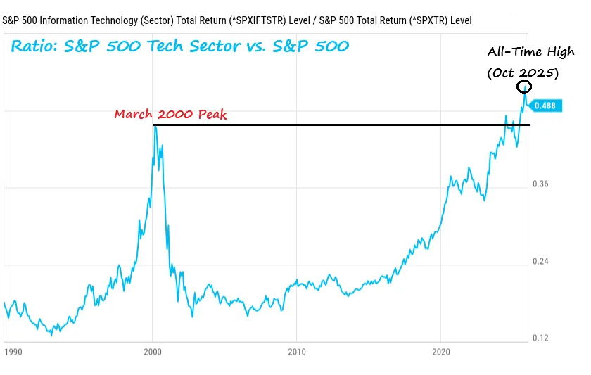 Regardless of how one dices and slices, a rotation out of tech could hurt the large-cap stock space. Consider the Spider Select Sector Technology ETF (XLK). It has never been more oversubscribed relative to the broader market’s S&P 500 SPDR ETF (SPY). This includes the dot-com internet collapse in 2000.