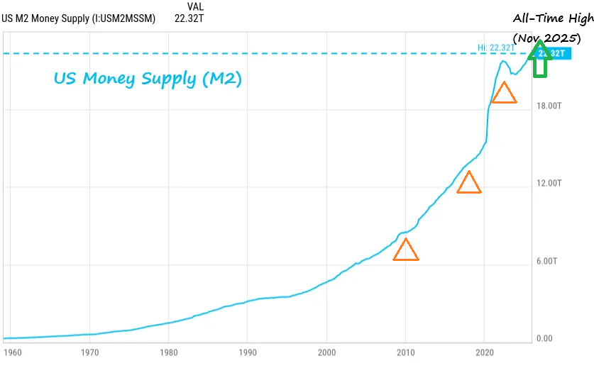 The opposite is true as well. When the money supply grew less in 2011, 2018 and 2022, stocks had a more difficult time appreciating. The ongoing creation of dollars since Q4 of 2025, though, implies that more dollars are likely to find their way into stocks.