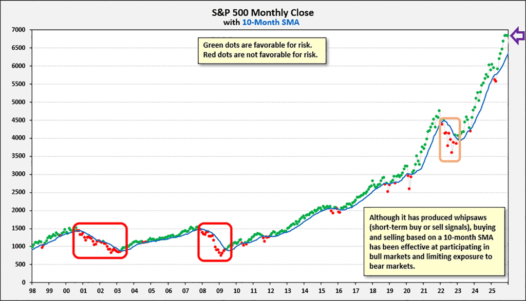 Similarly, a “red dot” warning appears when the S&P 500’s monthly closing price falls below its long-term trendline. This signal would trigger additional reductions in stock exposure to help safeguard client portfolios from the risk of a severe bear market decline.