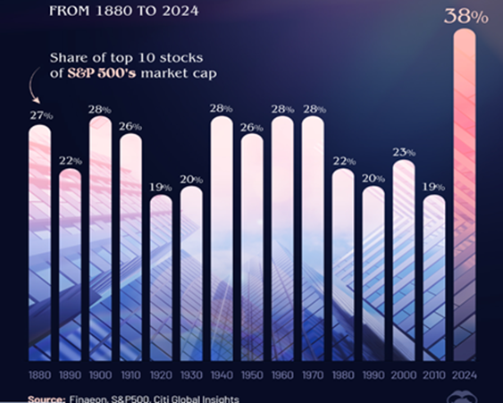 Consider the fact that 10 U.S. stocks account for a larger percentage of the U.S. market than at any other time in recorded history. A whopping 38 percent of the S&P 500 Index’s price movement is attributable to these mega-corporations.