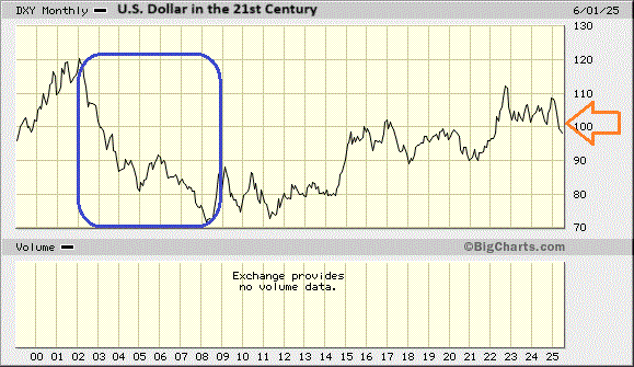 It has happened before. The U.S. dollar struggled mightily in the first decade of the 21st century. Correspondingly, international equities outshined U.S. equities by a wide margin from 2002-2008. (See the dollar depreciation in the blue box below.)