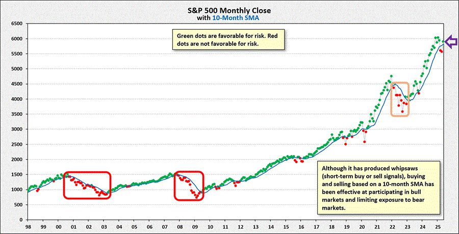 Regarding portfolio positioning at Pacific Park Financial, technical indicators support the notion that a long-term stock uptrend is present. Most notably, the monthly closing price for the S&P 500 sits above its 10-month moving average, while the moving average itself is ascending higher. (See the purple arrow and the blue trendline below.)
